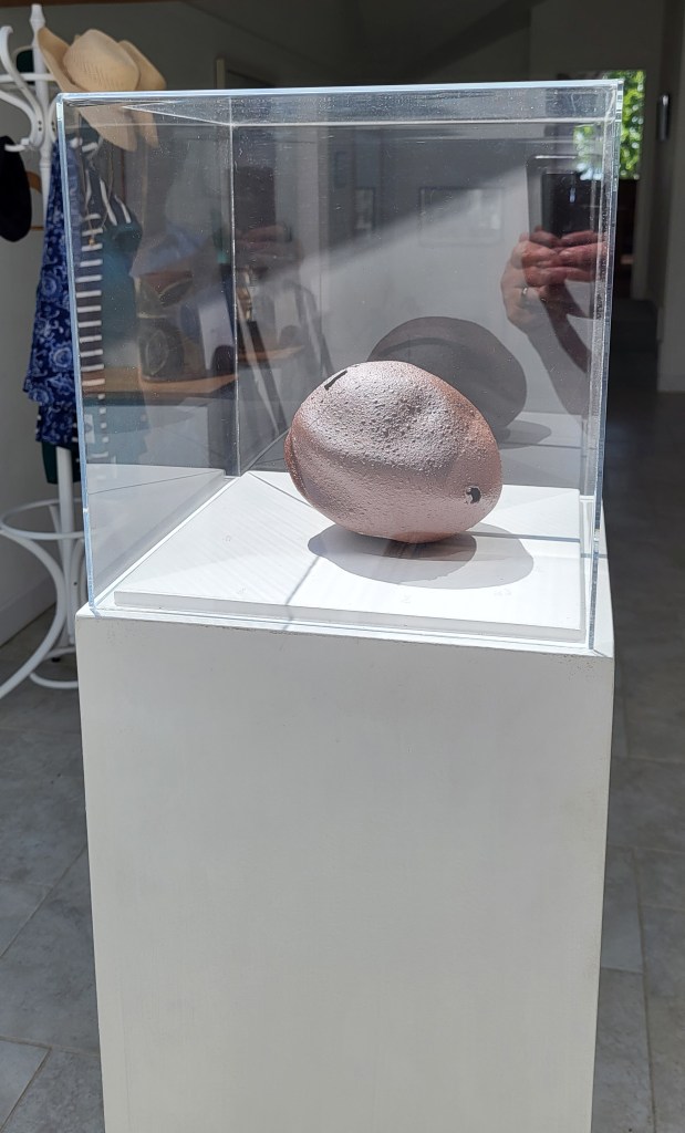 My tutor is anti-plinth but I am going to show a single piece in an enclosed plinth. This is possibly the most valuable piece of all the work: It is made of nothing but found clay. It is so thin and light and fragile. The clay is from Blacknest Fields in Hampshire, the focus of much of this work and, as such, it represents one of our most fragile, valuable resources: the earth beneath our feet!