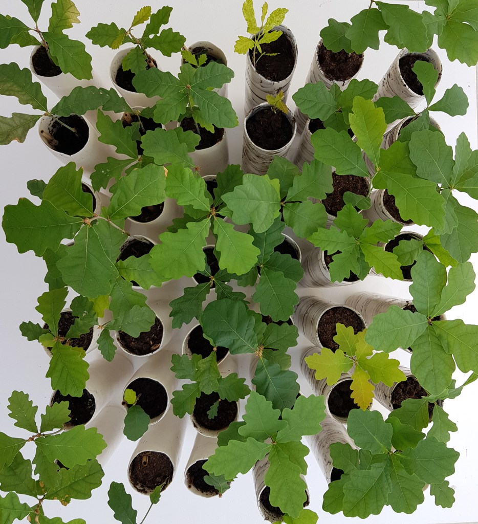 I made cylinders of porcelain and local clay. In these I planted 25 acorns from this one tree. With time, warmth and care, a new forest germinated in my studio